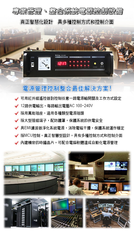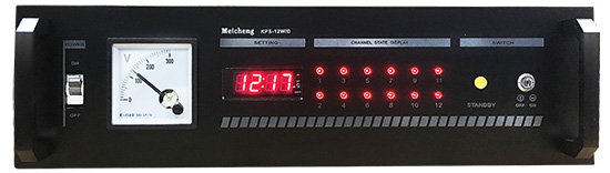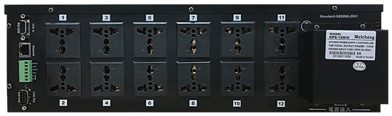 本產品配置空氣開關(60 A)及工業用指針式電壓錶頭(300 V)。設計容量11 KW。電源輸入採大型接線端子,配置防護罩,保護系統的供電安全。提供12路供電輸出,每路輸出電壓AC 100~240V(20 A),採用萬能插座,適用各種類型電源插頭。