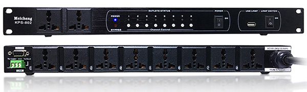 共8路電源受時序控制,每路的開關之時間間隔為1~10秒,亦可設定常開、互鎖、投影機專用[由控制軟體來設定]。