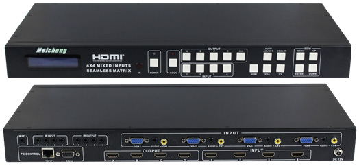 該混合矩陣切換器採用先進數位處理技術,具影像Scaler(影像處理與轉換)後傳送到顯示器或是電視機的功能,實現並達到了多種格式訊號統一輸出、無縫切換的完美視覺效果。同時紅外線遙控矩陣功能、類比影像訊號輸入兼具音訊嵌入功能。控制方式多樣靈活,可透過前面板按鈕控制、IR控制、RS-232控制、TCP/IP控制。