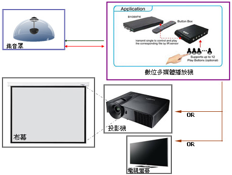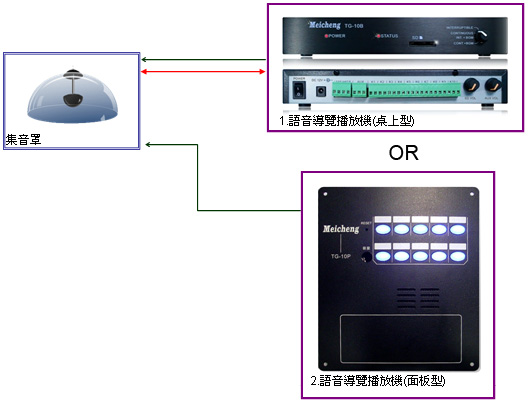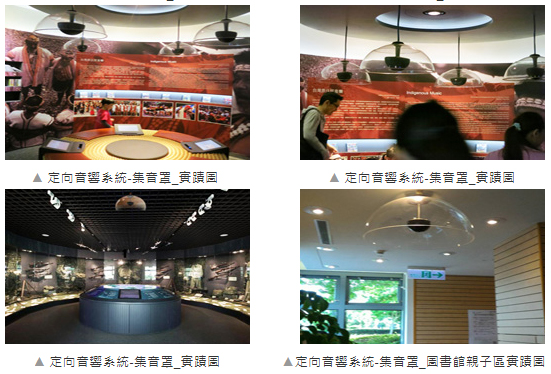 定向音響系統(集音罩),採紅外線自動感應系統,可搭配各型式定點自動語音導覽講解,適用在多個特定區域不斷地重複播放不同的展示內容,集音罩音箱將聲音傳遞給每個來此區域的參訪者,在不同展物前的參訪者能各自欣賞面前的展物音訊內容而不受相鄰展物的聲音干擾。紅外線感應器控制可接在任何發聲設備。當有人走進定向音響系統(集音罩)下方時,集音罩會自動播放聲音出來,當人離開後,集音罩則會自動停止播放聲音。