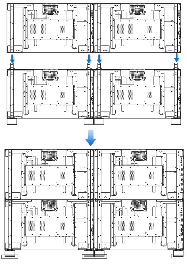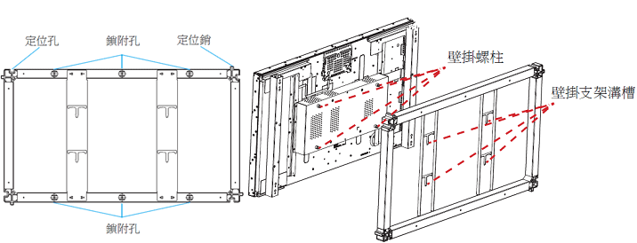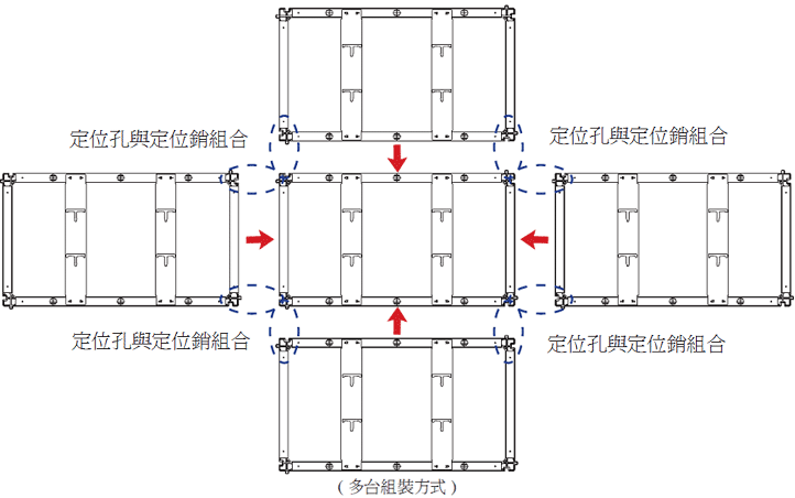 ▲ 多台固定方法:多台組裝時,可利用壁掛架上的定位孔及定位銷組合固定後,再直接鎖附於牆上。 |