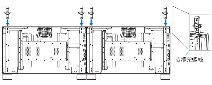 ▲ 立架式-固定方法:請將每台電視需鎖附兩支支撐架 (如上圖示)。
