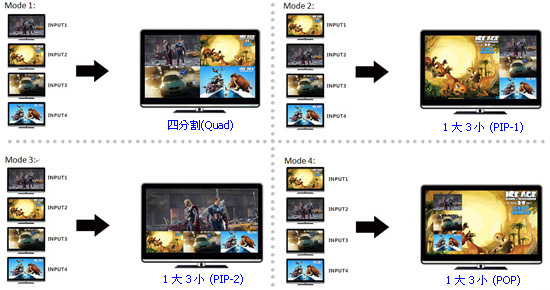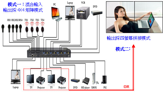 MX-1004VW是一款高性能電視牆拼接處理器:具畫面分割、無縫切換輸出及混合輸入4x4矩陣切換器,具4組混合訊號輸入 [支援數位和類比影像訊號],同時4組輸出具無縫切換功能,無縫切換輸出模式分別有:快速切換、淡入淡出、拉幕等16種特效。