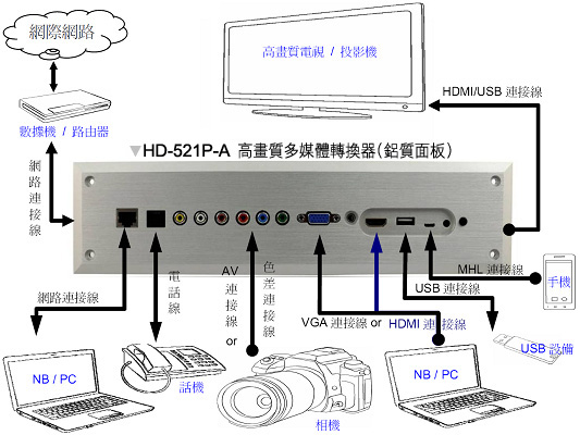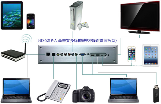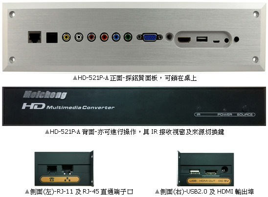 此款高畫質多媒體轉換器是專為增強客廳、客房、會議場合對複雜多樣化影音來源做統一控管而開發的多訊號整合之轉換裝置,在外型上就是一個可嵌入桌面有可接多種訊號來源的鋁質拉絲資訊面板。它能輕易實現僅透過單單一條HDMI訊號線材就能將各種影音訊號源(例如相機、智慧手機、平板電腦等)連接到您的高畫質電視上,且支援訊號源自動偵測,隨插即用;當在多組訊號源均有銜接時,則可自由切換。同時,這款產品還配備了RJ-45/RJ-11/USB2.0直通端子口,方便寬頻網路、電話、USB等來源設備的接入,真正達到單一個資訊面板卻能享有全功能、全高畫質的影音體驗。