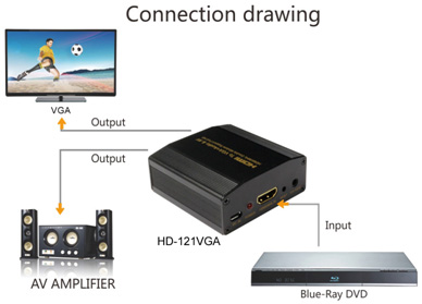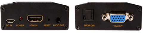 這是一款專用於將1組高解析HDMI數位訊號轉換為成VGA類比影像訊號和SPDIF數位聲音及AUDIO類比立體聲聲音訊號輸出的產品。適用所有具標準HDMI輸出介面的設備(例如:藍光DVD、PS3、Xbox360、數位機上盒、高畫質播放機、PC主機等)。VGA輸出可連接支援VGA訊號的顯示器、電視機或投影機等。SPDIF與AUDIO可輸出高品質聲音至擴大機。