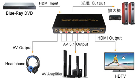 支援1組HDMI高畫質影音輸入、1組HDMI高畫質影像輸出、同步分離出HDMI聲音訊號,支援1路SPIDF光纖數位音頻輸出,同時解碼成5.1聲道RCA模擬類比音訊和1組耳機輸出。