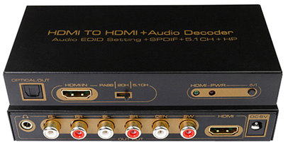 這是一款可以將1組HDMI影音同源的訊號源中同步分離1組HDMI輸出和SPDIF光纖輸出,同時經內部音訊DSP解碼及高品質DAC轉換後輸出5.1聲道類比音訊,方便能額外連接到未配備HDMI端子的AV擴大機或環繞音效喇叭。可與DVD、藍光播放機、網路播放器、數位機上盒、PS2、PS3、Xbox360、PC等眾多娛樂設備的HDMI高畫質輸出端對接使用,讓您能夠享受高品質的聲音。