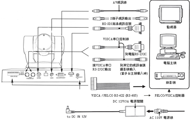 使用RS-485/RS-232(VISCA協議)介面,可對攝影機的所有設定以及平移/俯仰/縮放操作進行遠端高速通訊控制。