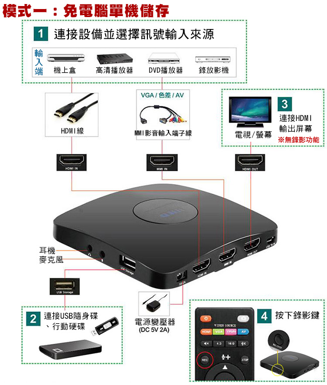 可不用連接電腦獨立工作,支援各類型USB隨身碟、行動硬碟(最高支援至2TB),一鍵即可錄製。